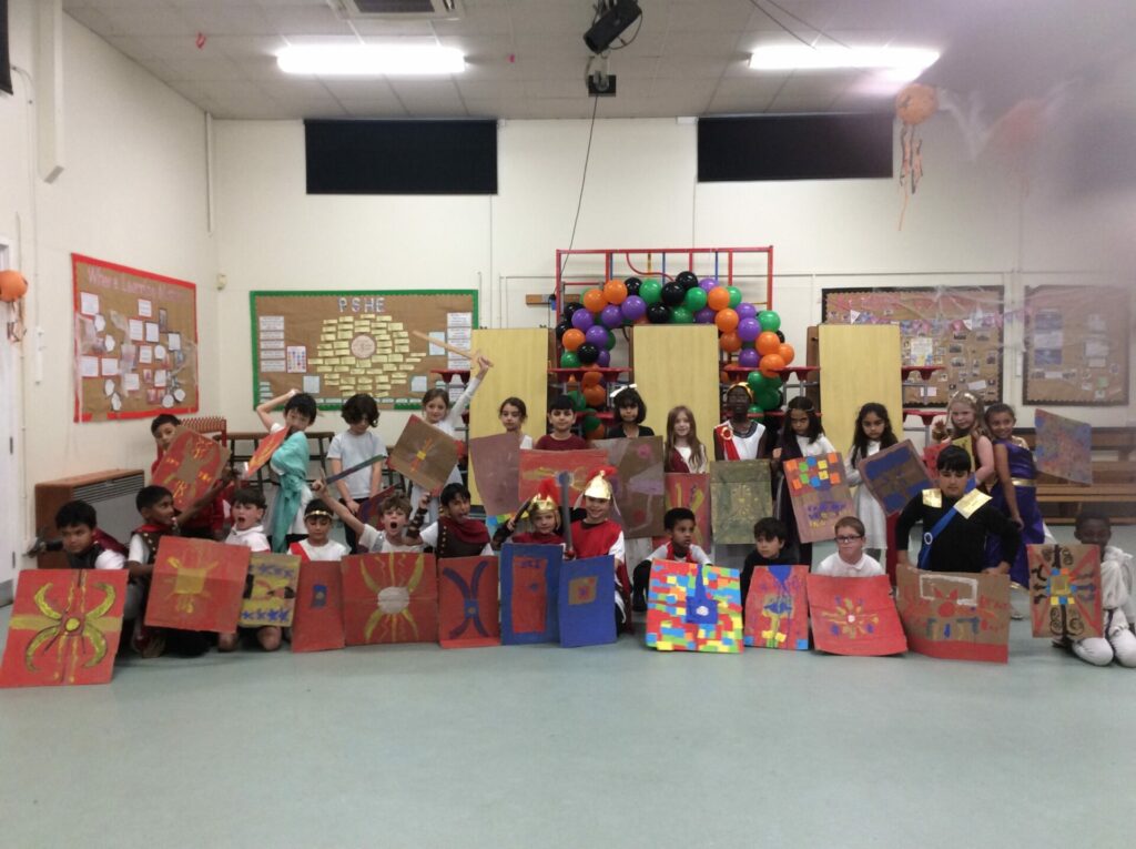 Year 4’s Roman day took place on Thursday this week where the children came to school dressed as Roman Soldiers, Emperors and several Queen Boudicas and Queen Cartimanduas. The children designed and made a shield too, which can be seen in the photo.
